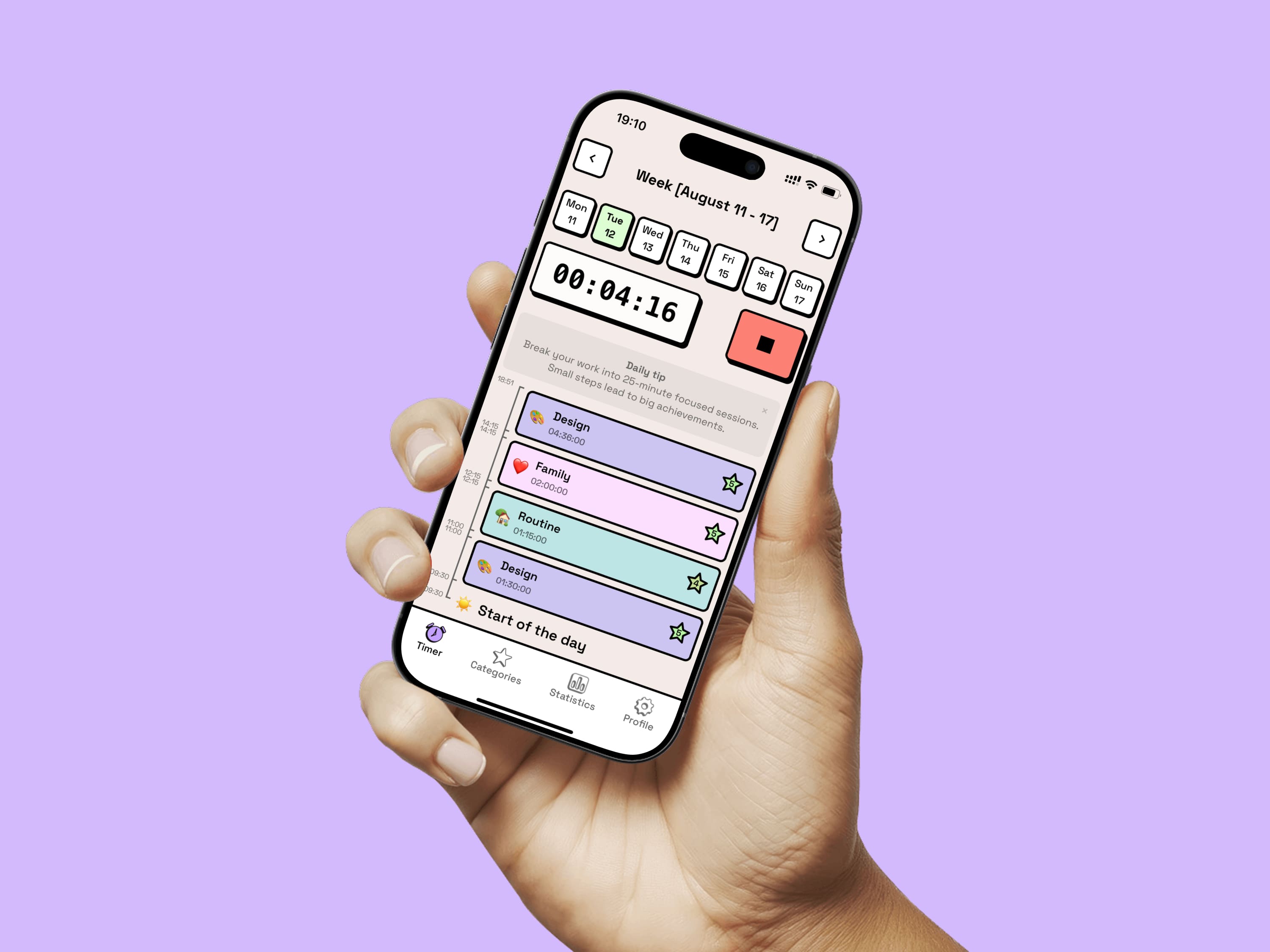 Add custom categories like Work, Family, Hobby or Learning. Use emojis and colours to make tracking feel personal and fun.